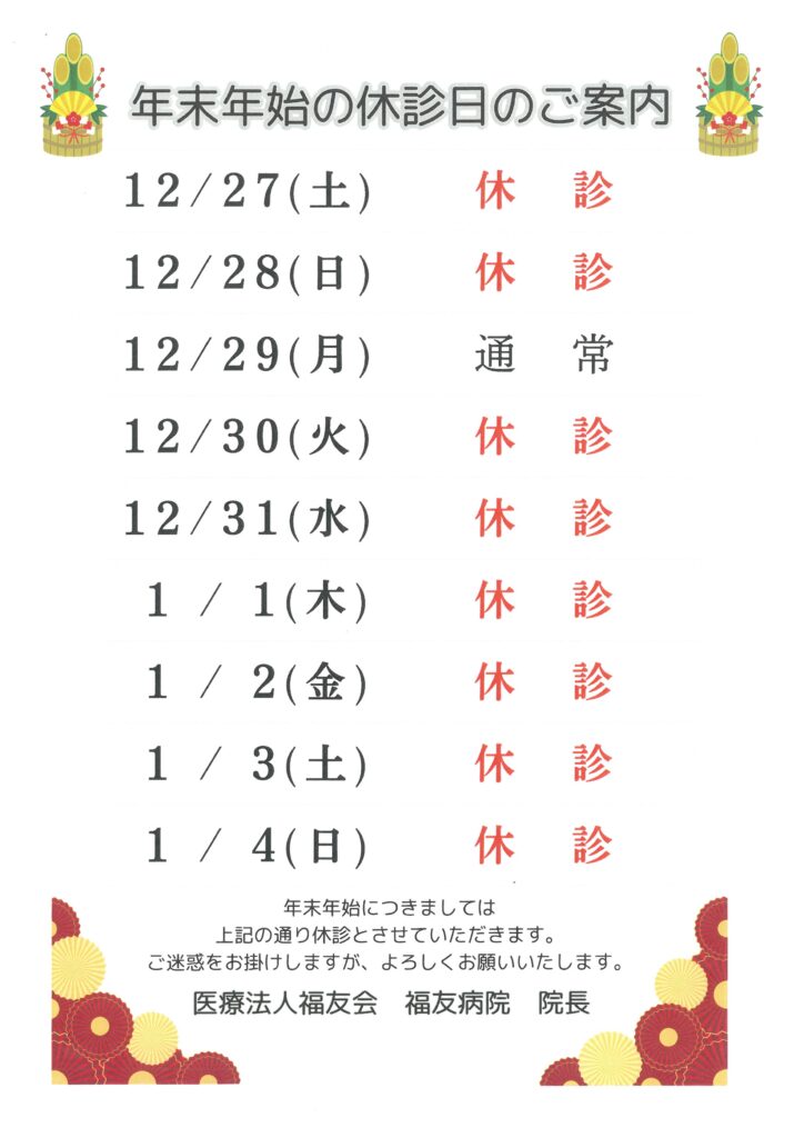 年末年始の休診日のご案内