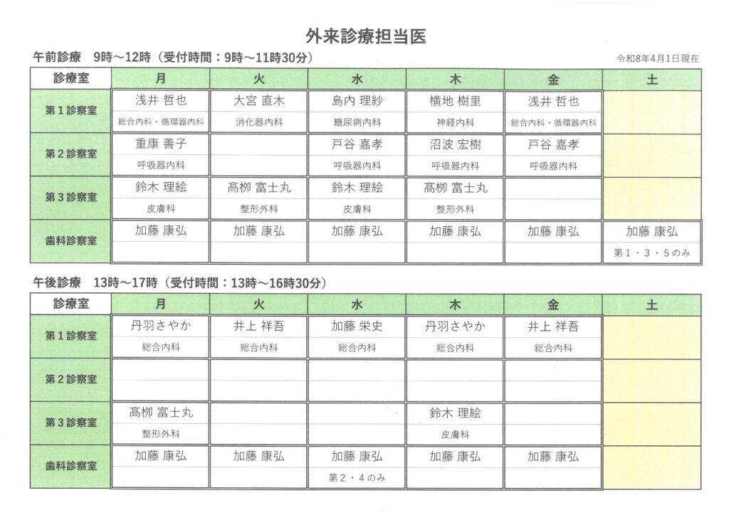 令和8年4月1日(月)から外来診療担当表が以下のとおり変更となりました。